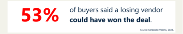 53% of Buyers said that a losing vendor could have won the deal. This is a massive amount of opportunity and revenue that you leave on the table. You might be thinking that this is easy to solve? As a seller you just need to take the time to do a loss analysis, learn from it, and then next time you won’t make the same mistakes in your customer engagement. Easy, right?