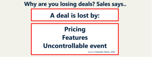 No, it isn’t, because if you look at the reasons that a seller gives for a loss, compared to the reasons the buyers give for a loss, 50% of the time sellers identify different reasons for the loss than what the buyer identifies. Let that sink in. Half of time the seller is wrong about why the deal was lost. While Corporate Visions’ research shows 50%, Gartner’s research shows that 70% of the time the seller got it wrong.