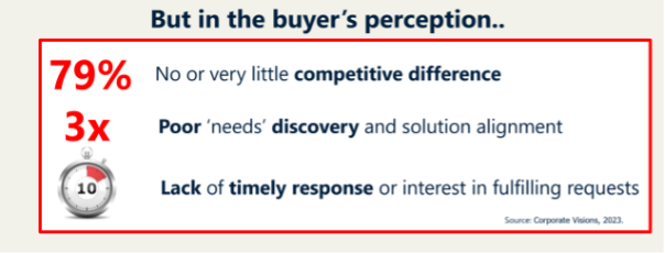 Of course, these figures might be slightly higher or lower for you in your organization, but the fact is, this is a very significant percentage you are losing of winnable deals. So, for your customer engagements, it is important to better understand where the misperceptions are. Let’s dive into that.